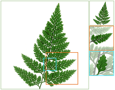 Autossemelhança porque um pequeno pedaço do fractal é similar ao todo (veja como esta folha de samambaia é similar à própria samambaia). Complexidade infinita porque não conseguimos representar completamente um fractal, visto que os padrões se repetem em infinitas iterações.